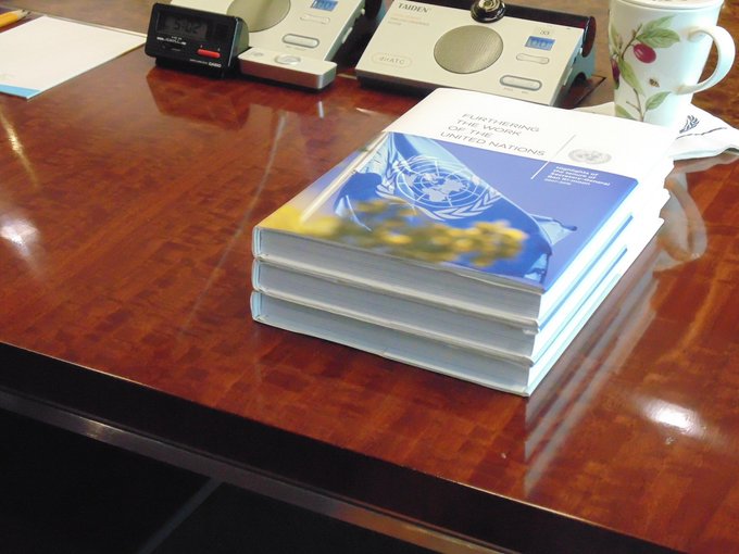 Take for example the hard cover book on his conference table when he met on September 18 with Donald Tusk, President, European Council and Frans Timmermans, First Vice-President, European Commission. Inner City Press subsequently went and saw it give to Poland, Chad and it seems clear (all) others.